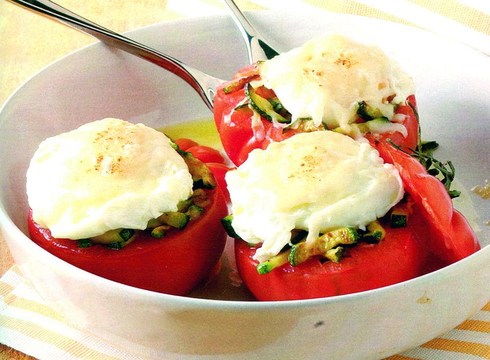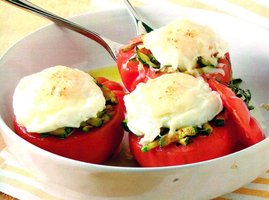 Priprema: paradajzu pažljivo odrežite gornji dio i kašikom izdubite sredinu. Na 3 kašike ulja propržite sitno isjeckan luk i tikvice izrezane na listiće, posolite pobiberite, uspite vino i kuhajte pokriveno 10 minuta. Dodajte peršun, promiješajte i kada se ohladi napunite paradajz. Pospite parmezanom i pecite 8-10 minuta na 180°. Jedno po jedno jaje pažljivo razbijte u tanjir, te svako posebno kuhajte 3 minuta u slanoj vodi sa malo sirćeta. Na svaki paradajz stavite jaje, pospite parmezanom, stavite komadić putera i vratite u rernu još 1 minut.