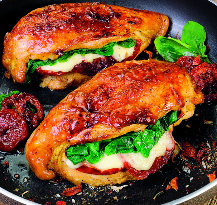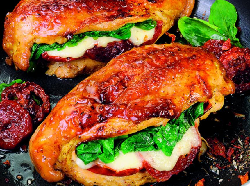 PRIPREMA: Pileća prsa zarezati tako da se napravi džep. Posoliti i pobiberiti ih pa u džep staviti sušeni paradajz, krišku, dvije mozzarelle i listove špinata. Tokom pečenja nadjev će možda malo iscuriti van, ali pomiješat će se sa sokovima od pečenja i bit će ga slatko pokupiti komadom hljeba. No, ako želite to izbjeći, zavežite meso kuhinjskim koncem ili pričvrstite čačkalicom. Meso pecite na tavi na laganijoj vatri dok ne dobije lijepu boju.