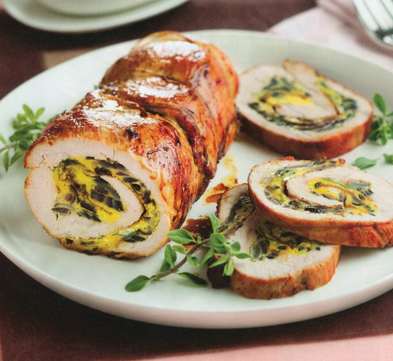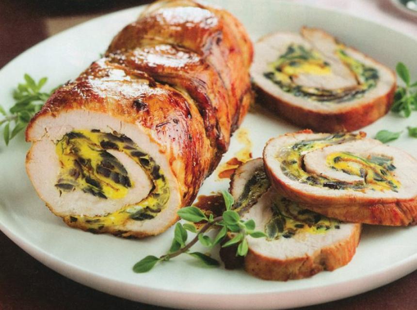 PRIPREMA: Luk oguliti, isjeckati i staviti u tepsiju prekrivenu papirom za pečenje. Posoliti, poprskati sirćetom i peći desetak minuta na 180 stepeni. Umućena jaja pomiješati s isjeckanim biljem, malo muškatnog oraščića, posoliti, pobiberiti i umiješati luk. Zagrijati ulje u većoj tavi, usuti jaja i ispržiti omlet. Odrezak lagano istući, preko staviti omlet, urolati, svezati i na malo ulja pržiti sa svih strana u većoj tavi. Prebaciti u tepsiju i peći oko jedan sat na 180 stepeni; povremeno zalijevati s malo supe.