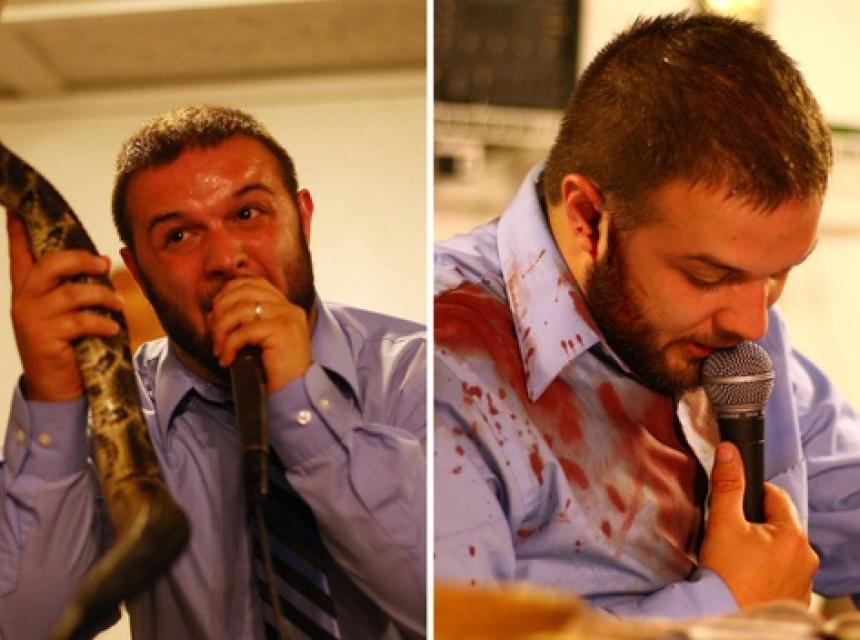 Američki pastor Kodi Kuts (Cody Cuts) tokom mise je uzeo zvečarku, stavio je oko vrata, a potom krenuo u transu da igra. Uznemirena životinja ga je napala, ujevši ga za rame, a potom za lice i vrat.