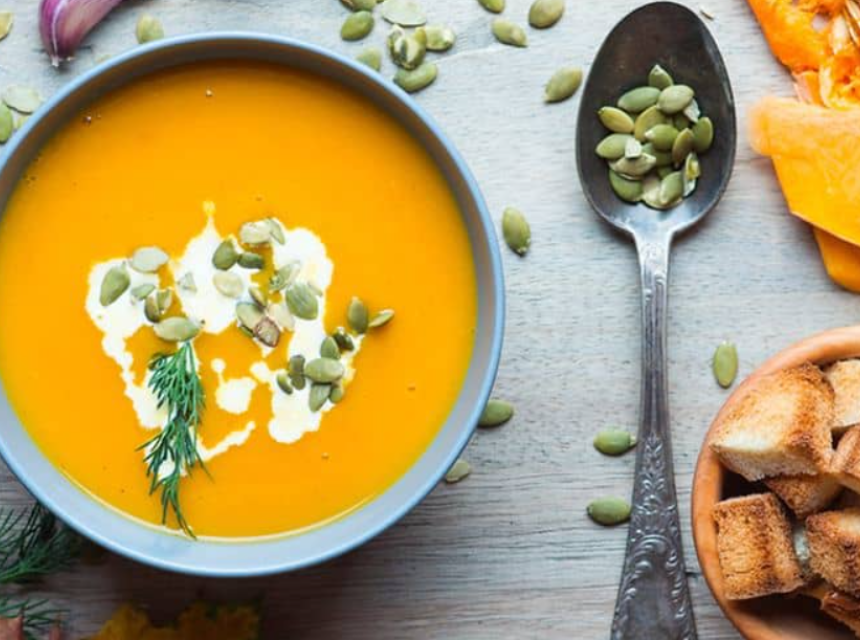 Zagrijte dvije kašike maslinovog ulja u velikom loncu, zatim lagano dinstajte dva sitno nasjeckana luka otprilike pet minuta, dok ne omekšaju. Dodajte tikvu narezanu na kockice, pa nastavite kuhati 8-10 minuta uz povremeno miješanje, dok ne počne omekšavati i dobivati zlatnu boju. Ulijte 700 ml povrtnog ili pilećeg temeljca i začinite solju i biberom. Zakuhajte, zatim kuhajte na laganoj vatri 10 minuta, dok tikva ne omekša. U lonac ulijte 150 ml vrhnja za kuhanje, ponovno zakuhajte, pa štapnim mikserom ili u blenderu napravite gustu kremastu supu. Za baršunastu konzistenciju možete supu izliti kroz gusto cjedilo. Začinite je po ukusu, a zatim poslužite posutu krutonima i sjemenkama i pokapanu s još maslinovog ili tikvinog ulja.