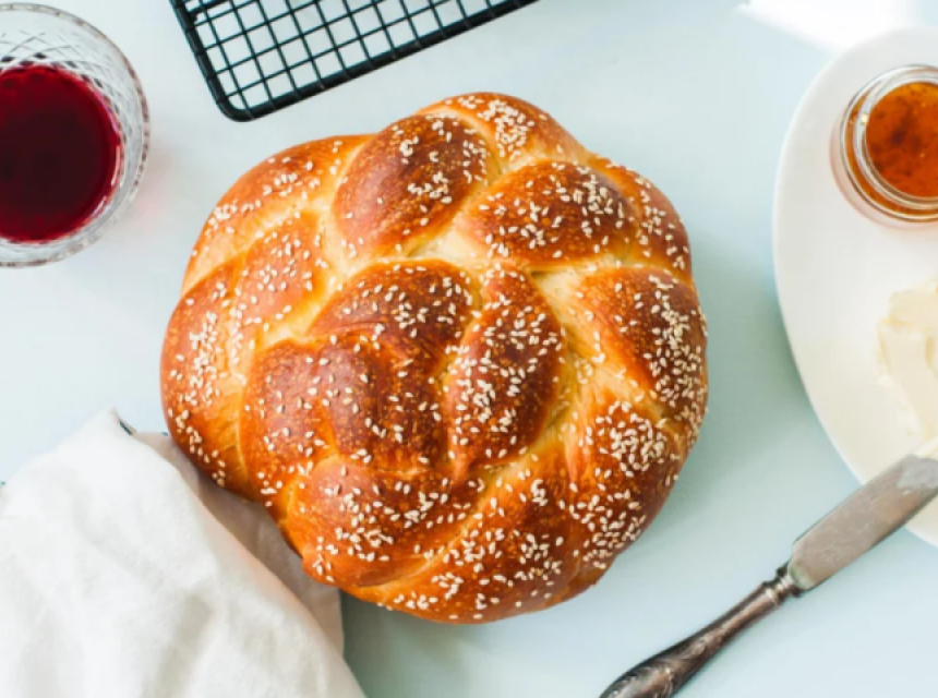 Dobivenu pogaču premjestite u posudu za pečenje pa uz pomoć tupe strane noža urežite ukrase po želji, premažite pogaču preostalim žumancetom i pospite susamom. Pecite u rerni zagrijanoj na 200 stepeni oko pola sata.