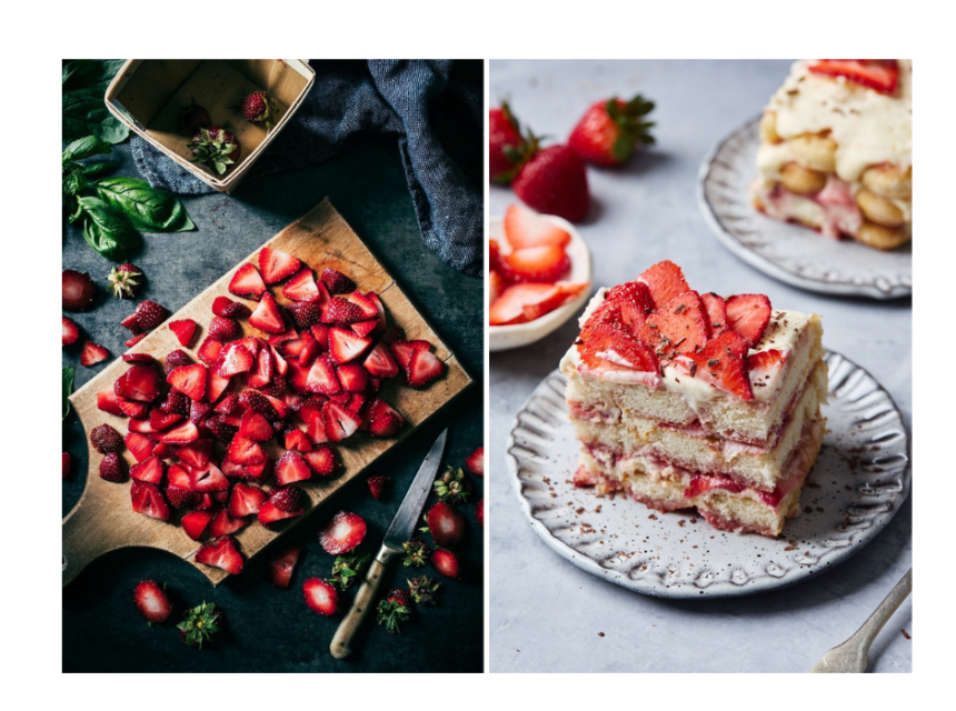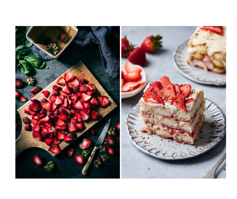 Jagode očistite, operite i narežite na tanke ploške. Slatko vrhnje istucite u šlag. Mikserom razradite mascarpone i dodajte mu šećer pa još malo miksajte. Zatim ručno u mascarpone umiješajte šlag. Pripremite pravokutnu zdjelu po želji (vatrostalna, keramička, pleh…) u koju ćete slagati sastojke.