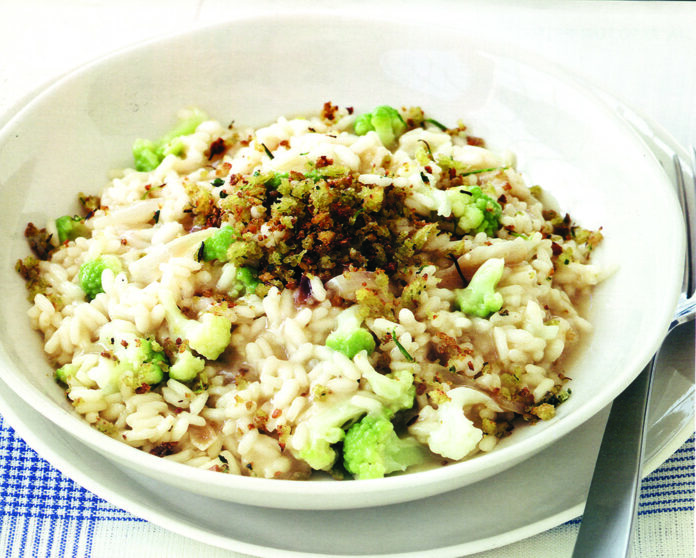 Priprema: Sitno isjeckan luk propržiti na 4 kašike ulja, dodati rižu te nakon par minuta pomalo dosipati vrelu supu uz stalno miješanje; kuhati na laganoj vatri. Prstima razdvojiti cvjetove karfiola i brokula, obariti u slanoj vodi, ocijediti i dodati u poluskuhanu rižu. Izmiksati hljeb, inćune, kašiku majčine dušice i malo ulja te kratko propržiti u teflon tavi. Dobivenom smjesom posuti rižoto, pobiberiti i poslužiti.