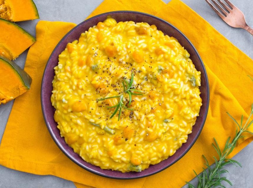 5. Podlijevajte rižu temeljcem dok se ne skuha. Pred sam kraj umiješajte kremu od sira i bundeve, kuhajte još par minuta, maknite s vatre, poklopite i pustite kratko da se rižoto odmori.