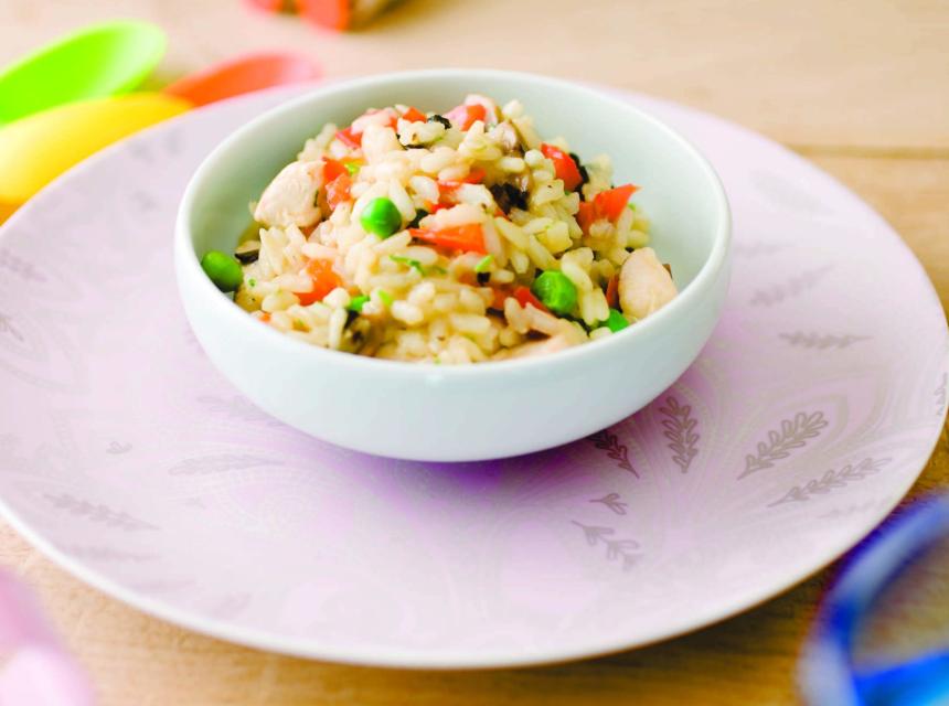 2. Rižu operite i dodajte povrću pa sve zajedno dinstajte 2 do 3 minute. Prelijte mlakom vodom da prekrije sadržaj u tavici, posolite, pobiberite i dobro promiješajte.