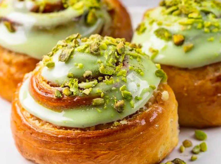 Zagrijte mlijeko i u njega potom stavite pola kockice svježeg kvasca i žličicu šećera te ostavite da se kvasac aktivira. Pomiješajte brašno, ostatak šećera, jaja, prstohvat soli i otopljeni maslac te potom dodajte kvasac s mlijekom. Umijesite tijesto, pokrijte ga i ostavite barem sat vremena da se diže. Kada je proces dizanja završen, razvaljajte ga u pravougao i prvo premažite s namazom od pistacije, a potom posipajte mljevenu pistaciju. Lagano i pažljivo rolajte i potom uz pomoć konca režite rolice koje ćete slagati na pleh u koji ste prethodno stavili papir za pečenje. Ugrijte pećnicu na 180 stupnjeva i neka se peku oko pola sata. Kada su rolice gotove, premažite ih glazurom koju ste dobili miksanjem krem sira, šećera i kreme od pistacije, a za potpun doživljaj po vrhu posipajte još mljevene pistacije.