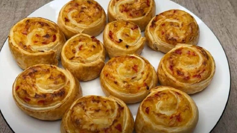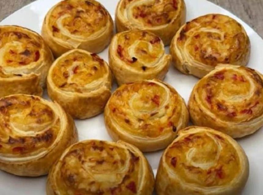 Ogulite i operite krompir, a potom ga isjeckajte na kockice. Stavite ga u šerpu i prelijte vodom, a potom dodajte soli po ukusu. Ostavite da provri, pa smanjite temperaturu i kuhajte dok ne omekša. Isjeckajte crni luk, pa zagrijte malo ulja u tavi i prodisntajte oko 3 minute. Očistite unutrašnjost paprika, pa ih isjeckajte. Dodajte ih u tavu sa crnim lukom, pobiberite, promiješajte i dinstajte nekoliko minuta uz miješanje. Krompir procijedite i dodajte puter. Napravite pire, a tvrdi sir izrendajte. U krompir pire ubacite dinstano povrće i promiješajte. Lisnato tijesto stavite na pek papir, pa rasporedite fil sa pireom i paprikama. Pospite tvrdim sirom, pa pažljivo urolajte. Isijecite rolnice, pa ih poredajte po plehu obloženom pek papirom. Umutite jaje, pa premažite rolnice. Pecite ih na 180°C oko 30 minuta.