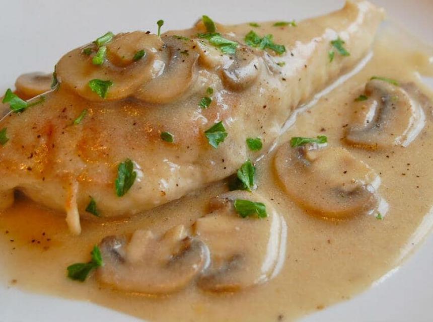 Posudu sada namažite maslacem. Dno ravnomjerno posipajte lukom. Na luk stavite pileća prsa koja prekrijete šampinjonima i pirjajte 30 minuta. Poslužite toplo, s pireom ili rižom.