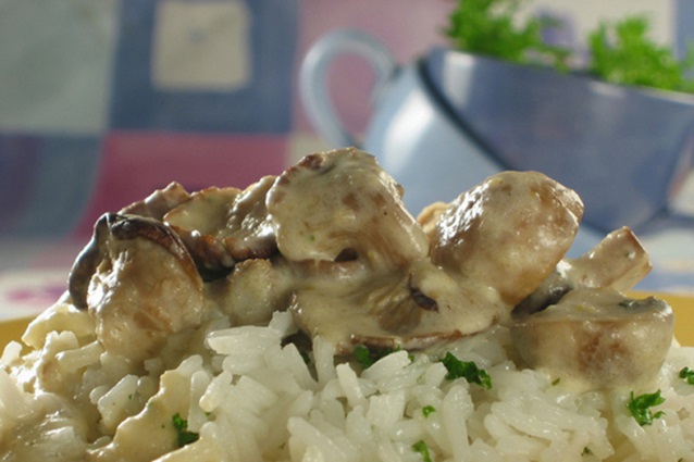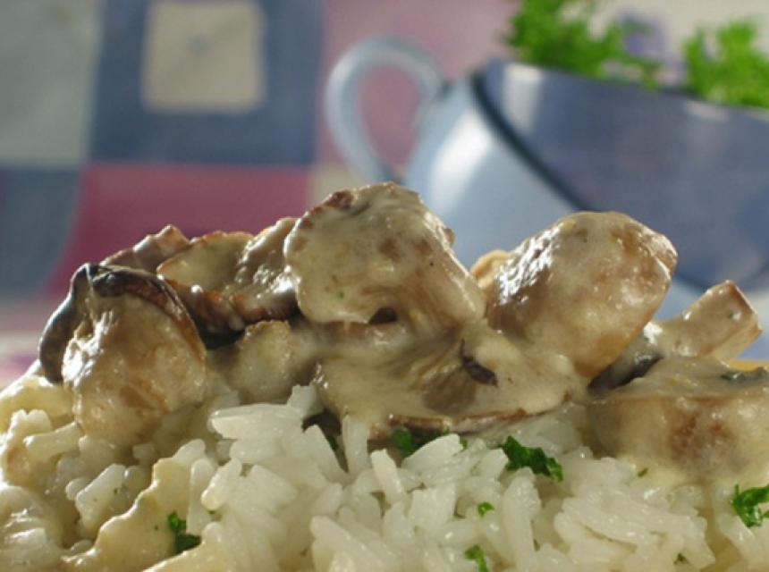 Gljive operite i izrežite na četvrtine. Na maslacu kratko prodinstajte nasjeckani luk, dodajte gljive, vegetu i biber, pa zajedno dinstajte na laganoj vatri dok tečnost ne ispari. Dodajte mrvice, pa dinstajte još oko pet minuta. Na kraju umiješajte kiselu pavlaku i pospite peršunom. Poslužite s kuvanom rižom.