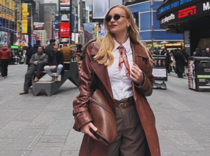 Pozirala je na Times Squareu u bijeloj košulji i strukiranim hlačama u smeđoj boji. Izgled je upotpunila dugim kožnim mantilom i torbicom, također u smeđoj boji, koja je hit sezone.