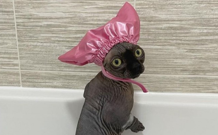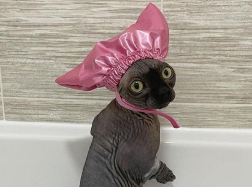 Riječ je o mački bez dlake koja oduševljava zanimljivim kreacijama za glavu, ali posebno je odjeknula nakon što se pojavila s ružičastom kapom za tuširanje, koju nosi na glavi kad je vrijeme za kupanje.