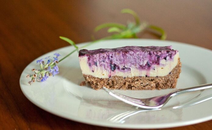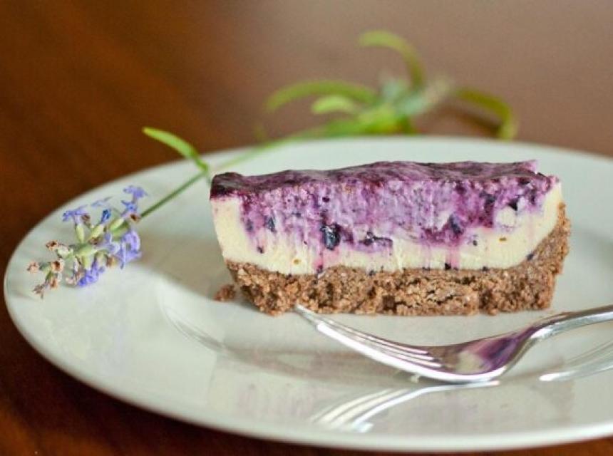 Potrebno: za koru: 80 g oraha i 50 g suncokretovih sjemenki (prethodno namočenih 4 sata u vodi s prstohvatom soli), 80 g kokosovog brašna, prstohvat soli, po 1 žličica meda i kakaa u prahu; za kremu: 200 g indijskih oraščića (prethodno namočenih 2 sata u vodi s prstohvatom soli), sok od 3 limuna, 80 g meda, 130 g kokosovog ulja, za preljev: 100 g borovnica, 2 kašike meda, 3 kašike kokosovog ulja