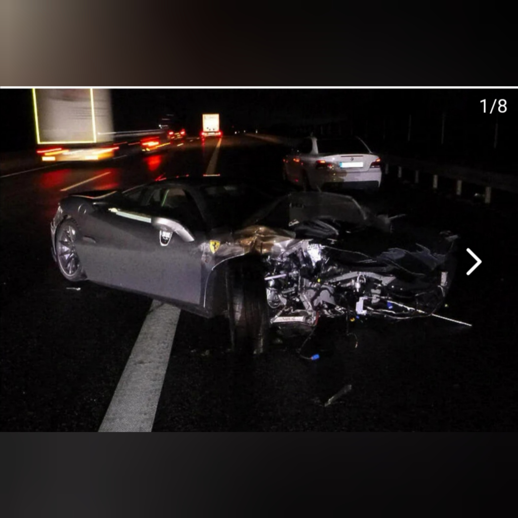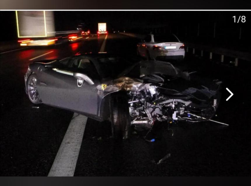 Jedina fotografija koja se pojavila u javnosti nakon saobraćajne nesreće pokazuje ogromnu štetu na prednjem dijelu automobila zbog koje je F8 Tributo neprepoznatljiv.