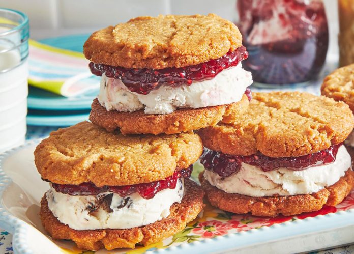 Za sendviče sa sladoledom: 7 ohlađenih kolačića, donjom stranom nagore, stavite na pleh i premažite svaki kolačić sa po jednom kašikom džema. Stavite u zamrzivač na 20 minuta da se džem stegne.
