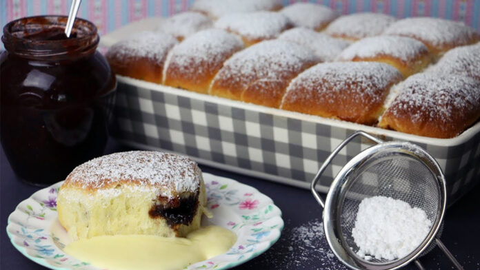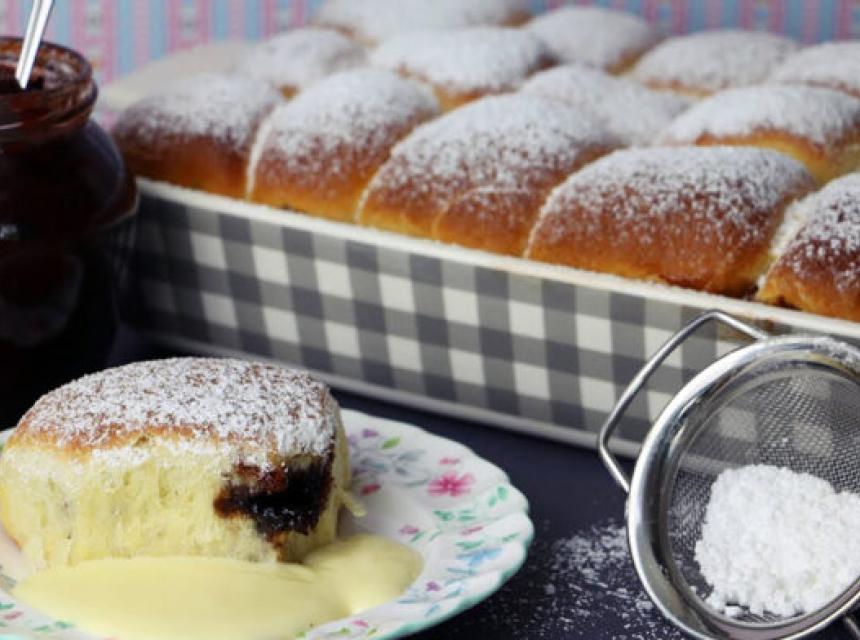 PRIPREMA: U mlako mlijeko dodajte 1 kašiku šećera i germu, izmiješajte i ostavite da nadođe, oko 5 minuta. Sve ostale sastojke stavite u zdjelu i dodajte mlijeko s germom. Umijesite tijesto i stavite ga u posudu koja je cijela namazana tankim slojem ulja ili putera i tijesto također malo namažite uljem, pokrijte plastičnom folijom i ostavite da se diže na toplom mjestu oko 1 sat. Naraslo tijesto podijelite na 20 loptica i malo ih doradite. Svaku lopticu malo dlanovima pritisnite da dobijete krug. Na sredinu stavite punjenje, dobro spojite krajeve tijesta da punjenje ne iscuri, cijelu lopticu premažite istopljenim puterom i redajte ih u podmazanu duboku tepsiju. Buhtle ostavite još oko 20 minuta da narastu i pecite u prethodno zagrijanoj rerni na 180°C oko 35-40 minuta.