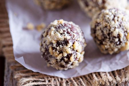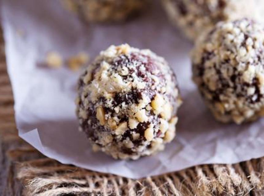 Čokoladu naribajte, šljive nasjeckajte na sitne komadiće, naribajte koricu mandarine. Mješavinu oraha, čokolade, sušenih šljiva i kore marelice prelijte zagrijanim sladom pomiješanim s mirinom. Oblikujte kuglice i uvaljajte u rogačeve mrvice ili u otopljenu čokoladu. Stavite u hladnjak na sat vremena. Mirin je vrsta slatkastog rižinog vina koje se koristi za aromatiziranje slastica i drugih jela. Ima niski udio alkohola. Česti je začin u japanskoj kuhinji i može se nabaviti u trgovinama zdrave hrane