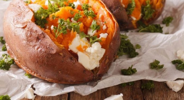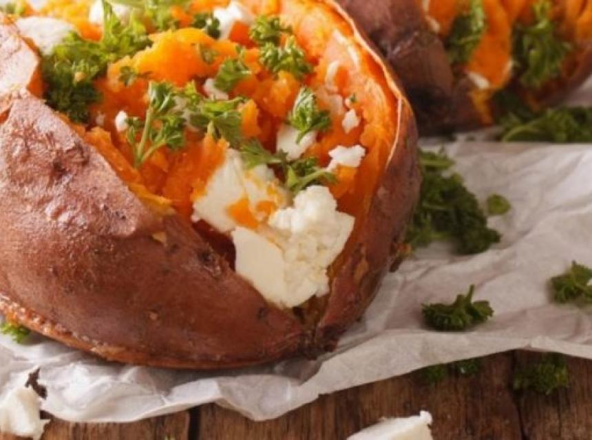 POTREBNO: 3 slatka krompira, 2 kašike maslinovog ulja, 2 filea bijelog mesa, prstohvat soli i bibera, kašika soka od limete, 4 nasjeckana česna bijelog luka, 1 nasjeckana ljuta papričica, kašičica bosiljka, 60g špinata, 230 g sira, 2 kašičice svježe nasjeckanog peršuna