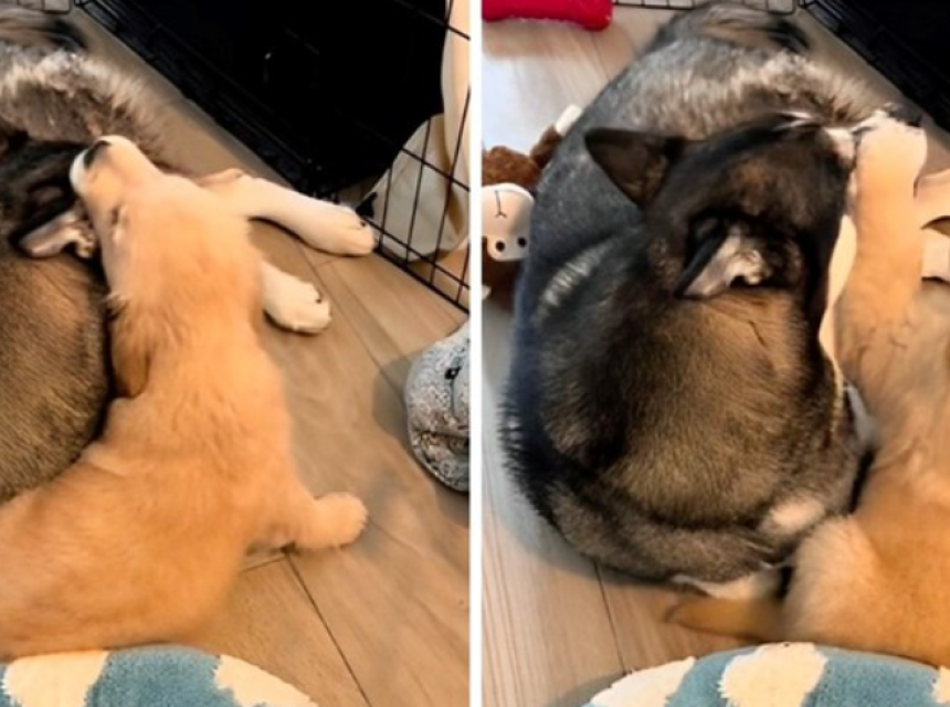 Svaki pas ima najboljeg prijatelja, a štene zlatnog retrivera pronašlo je svog najboljeg ljubimca u svom sustanaru - odraslom haskiju.