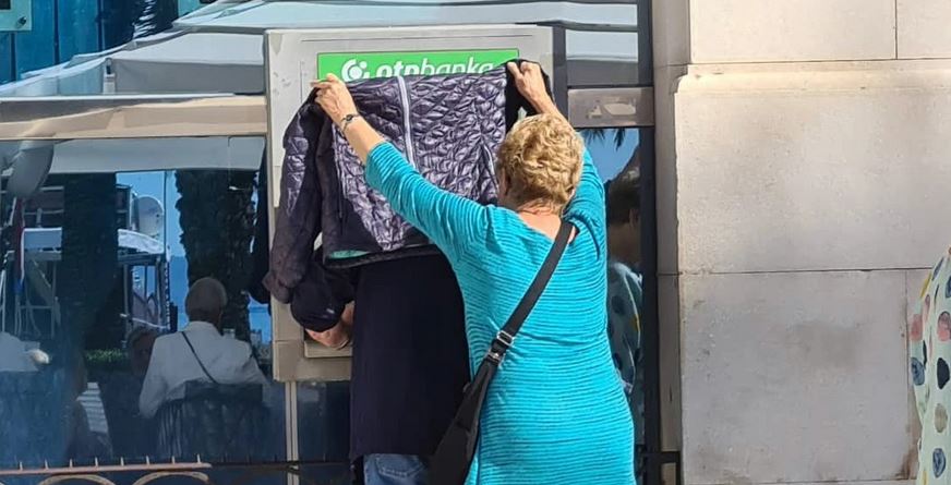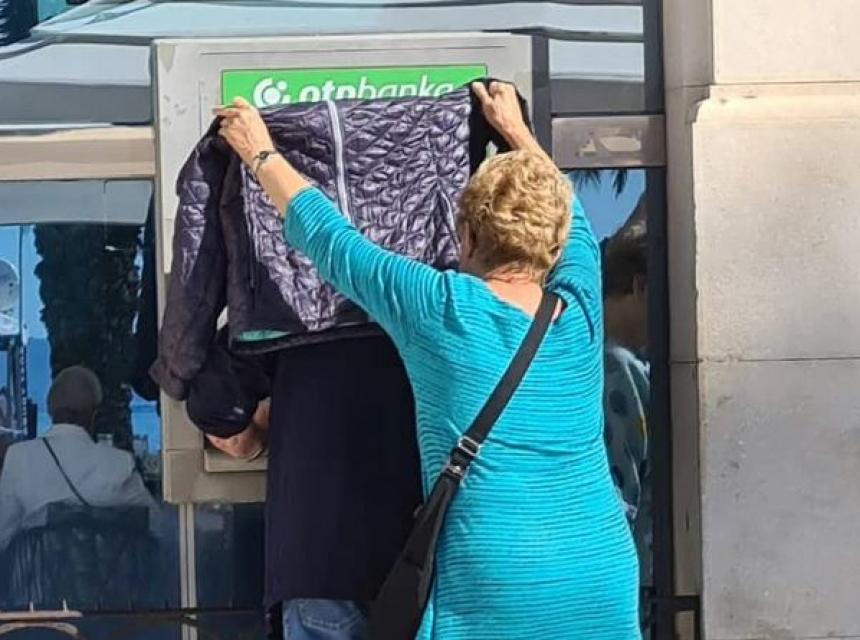 Fotografija prikazuje gospođu kako drži jaketu iznad muškarca koji koristi bankomat.