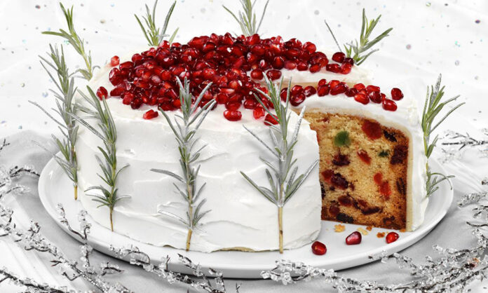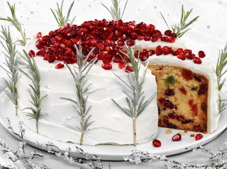 PRIPREMA: Ugrijte rernu na 170°C. Okrugli kalup obložite papirom za pečenje. U zdjeli umutite puter i šećer, dodajte jedno po jedno jaje i ekstrakt vanilije. Kada se ovo sjedini ubacite brusnice i voće. U drugoj zdjeli pomiješajte brašna sa praškom za pecivo pa umiješajte u masu sa puterom. Istresite u kalup i pecite sat i po. Izvadite iz rerne, ohladite, pa cijeli kolač premažite medom. Mijesite marcipan dok ne omekša. Pospite radnu ploču šećerom u prahu i razvaljajte marcipan u krug, pa prebacite na kolač koristeći oklagiju. Dlanovima utisnite marcipan tako da čitav kolač bude pokriven. Umutite dobro bjelanca, dodajte šećer u prahu, pa vanilin ekstrakt. Premažite preko marcipana. Grančice ruzmarina naprskajte sprejom i ostavite da se sprej osuši. Poredajte grančice ruzmarina oko kolača, a na sredinu vrha kolača istresite nar.