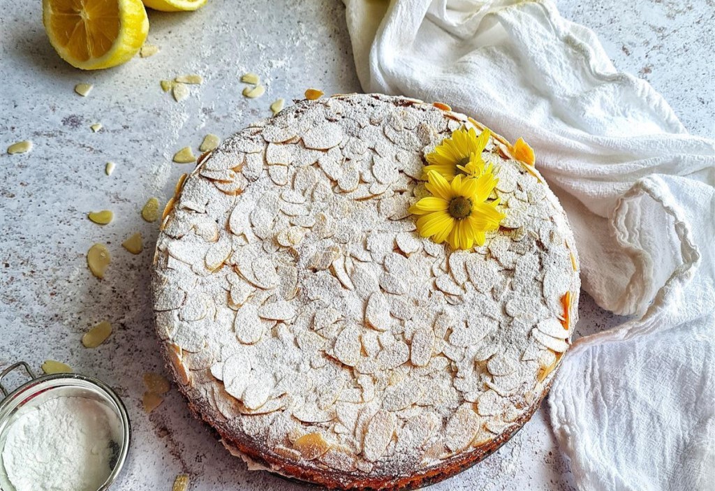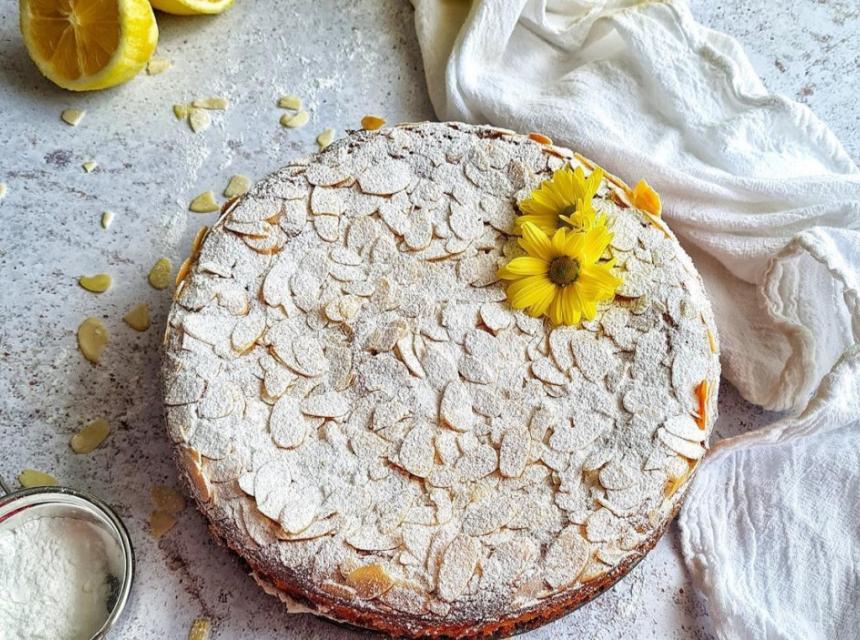 Pripremljenu smjesu staviti u namašćen i masnim papirom obložen kalup (promjer 20 cm), posuti listićima badema te peći u prethodno zagrijanoj pećnici na 180 stepeni 40-45 minuta. Ohlađen kolač posuti šećerom u prahu.