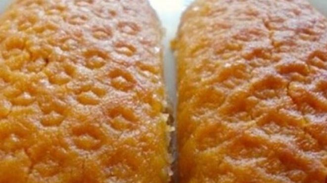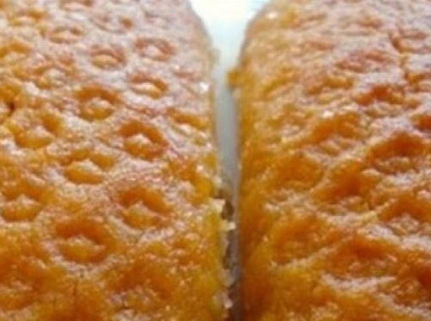 Pomiješajte puter (rastopljen) sa dva jajeta. Dodajte 7 kašika griza, 7 kašika šećera u prahu, 2 kašičice praška za pecivo, 2 kašike vanilin šećera i nastavite da miješate.