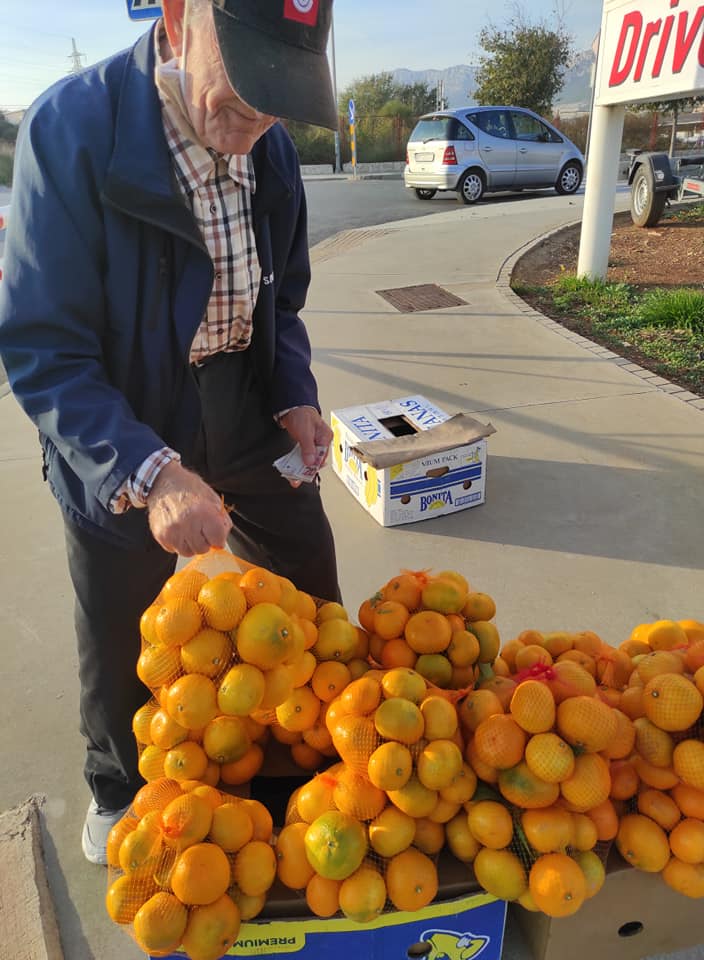 Mandarine koje prodaje nisu njegove, već prodaje za nekoga tako da pomozite mu da zaradi koju kunu da ima za skuhati ručak. Pak mandarina je 20 kn i baš su slatke.