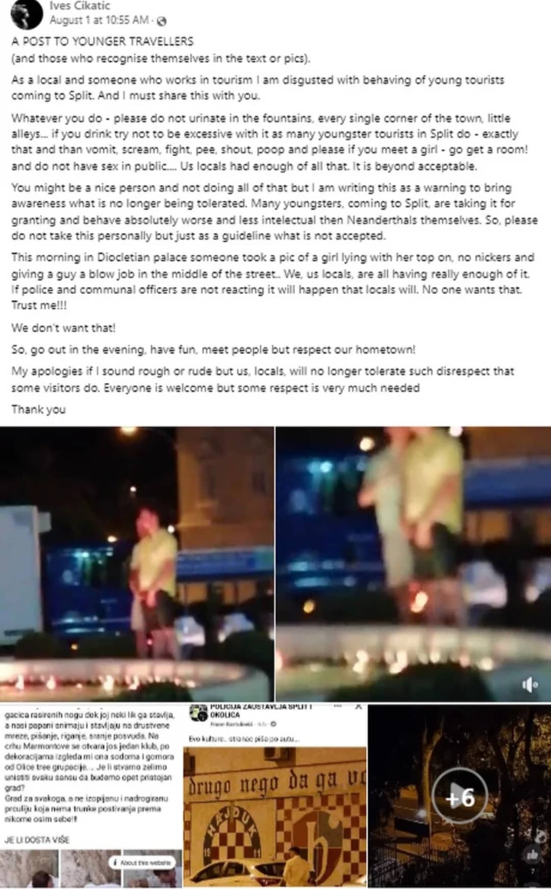 "Mnogi od vas koji dolaze u Split uzimaju to zdravo za gotovo i ponašaju se gore od neandertalaca. Niko od nas ne želi ovo, vjerujte mi. Izlazite, zabavljajte se, stičite poznanstva, ali imajte poštovanja prema našem gradu. Svi su dobrodošli, no poštovanje je itekako potrebno", zaključila je ona.