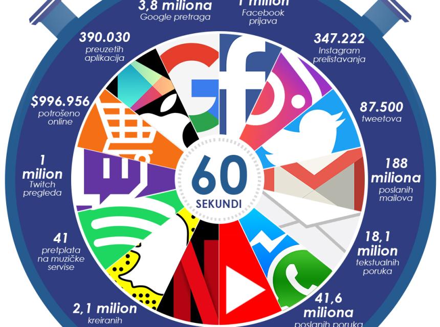 Kako je moguće da se 188 miliona mailova pošalje svaki minut? Procesuiranje 3,8 miliona pretraga na Googleu, 41,6 miliona poruka putem popularnih servisa Facebook Messenger i WhatsAppa, gotovo milion potrošenih dolara na online kupovinu... zaista izgledaju nevjerovatno.