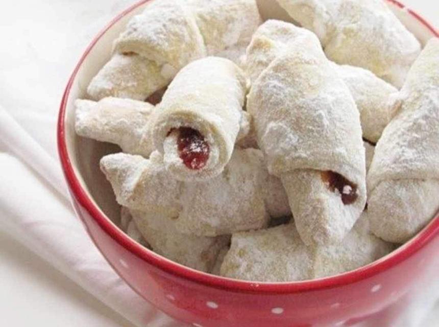 Podijelite na osam trokutića. Filujte na širem dijelu kiflice pa rolajte prema sredini. Poredajte ih u tepsiju i pecite u prethodno zagrijanoj rerni na 130 stepeni. Kiflice ne smiju porumeniti. Kada su gotove, ohladite i onda uvaljajte u šećeru u prahu.