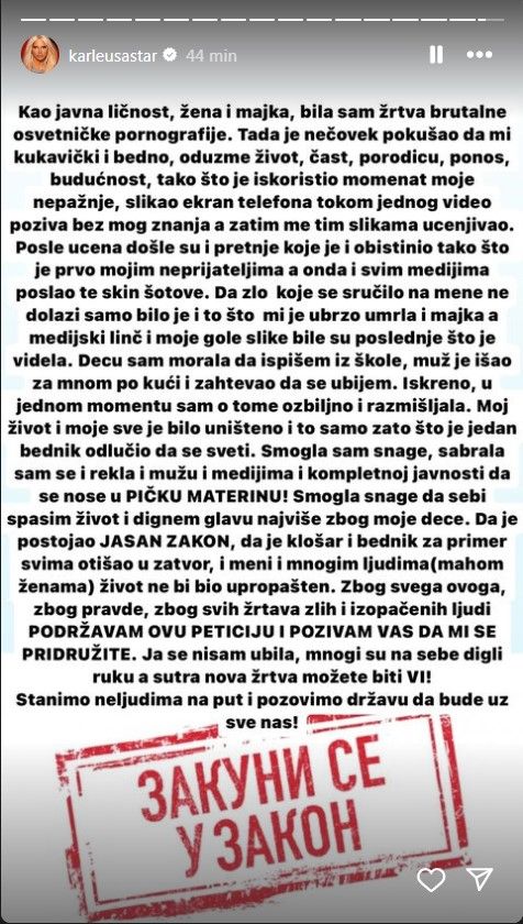Jelena Karleuša podržala je peticiju da neovlašteno djeljenje intimnih snimaka postane krivično djelo, a uz to je objavila i poruku u kojoj je iznijela potresne tvrdnje da ju je zakoniti muž Duško Tošić nagovarao da sebi oduzme život u vrijeme kada su u javnost i medije puštene njene nage fotografije i snimci.