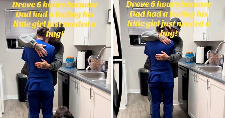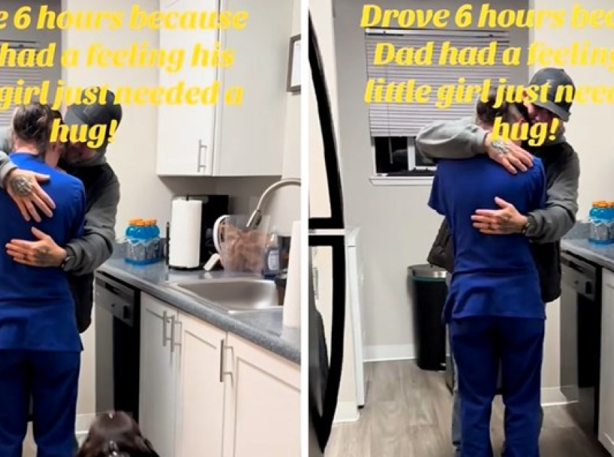 Tako je jedan tata, Coy Collins, osjetio da njegova kći treba nešto više od telefonskog razgovora. Bez razmišljanja sjeo je u auto i vozio šest sati kako bi je iznenadio. Video ovog emotivnog susreta pokazuje trenutak kada kći ulazi u stan, nesvjesna da je otac već tamo. Dok razgovara s osobom koja snima, Coy je strpljivo čeka u kuhinji. Kada ga ugleda, njezina reakcija govori sve – iznenađenje se pretvara u suze dok polako ide prema njemu.
