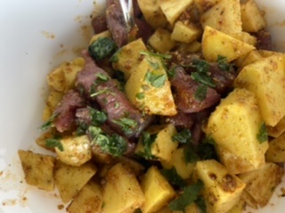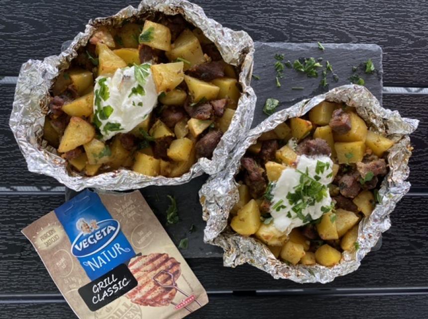 Oblikujte zdjelu od folije i pripremite je za punjene. Krompir izrežite na manje komadiće te začinite sa uljem, vegetom, crvenom paprikom i malo sušenog peršuna.