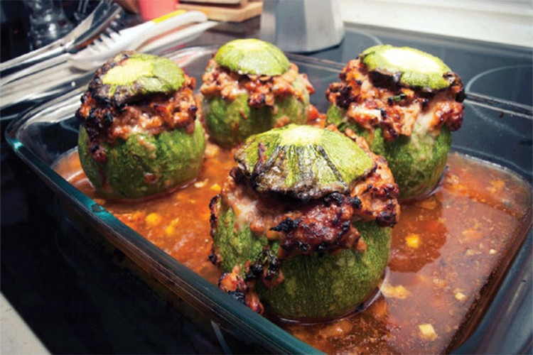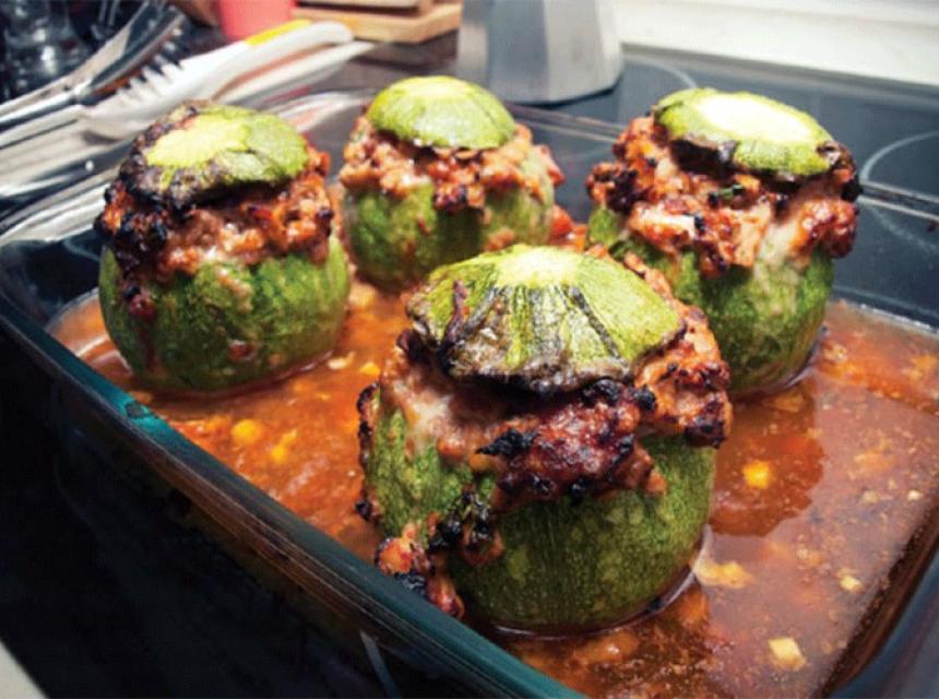 Oprane tikvice izdubite i stavite u pleh. Luk i izvađenu sredinu iz tikvica isjeckajte i prodinstajte na malo maslinovog ulja, pa dodajte tunjevinu, pelat, ajvar, origano, biber, so i još malo dinstajte.