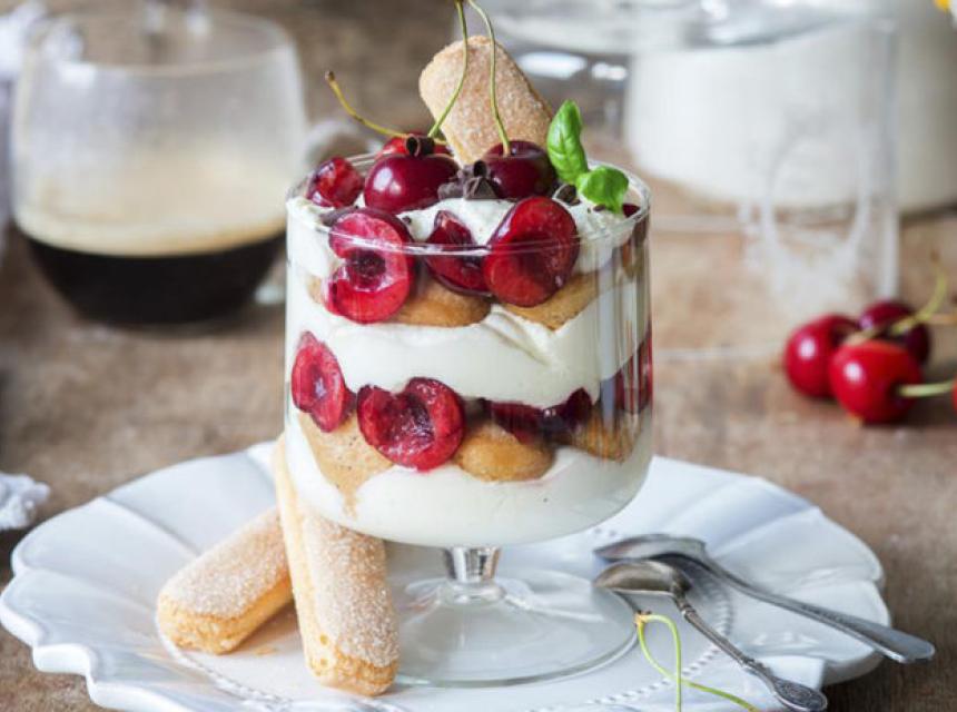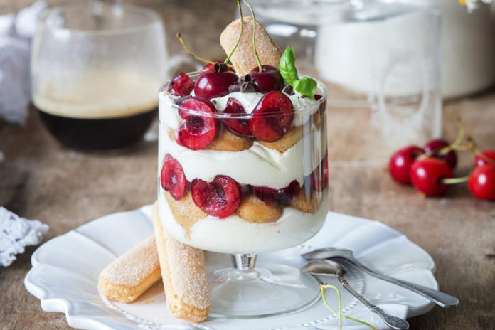 PRIPREMA: Mikserom izmiješajte žumanjke sa šećerom pa dodajete mascarpone i liker od badema. Kuhajte na pari dok se ne zgusne. Nakratko umočite piškote u kuhanu crnu kafu. Pazite da se ne natope previše. Na dno čaše stavite kremu, dodajte piškote i očišćene trešnje, još jedan sloj kreme, piškote, pa opet kremu i trešnje. Po želji, tiramisu pospite kakaom. Stavite u frižider i pustite da se hladi barem sat vremena prije posluživanja.