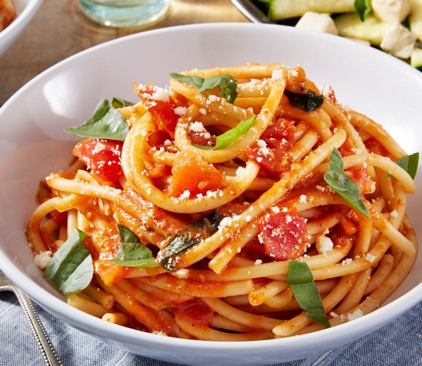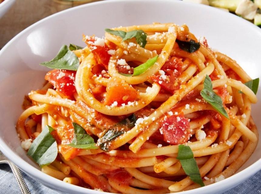 - Na maslinovom ulju popržite sjeckani bijeli luk, paradajz isječen na kockice i sitno isjeckan sušeni paradajz. Posolite i pobiberite po ukusu, i dolijte malo vode kako bi fino krčkalo dok tjestenina ne bude gotova.