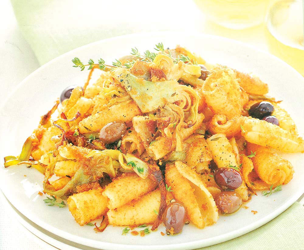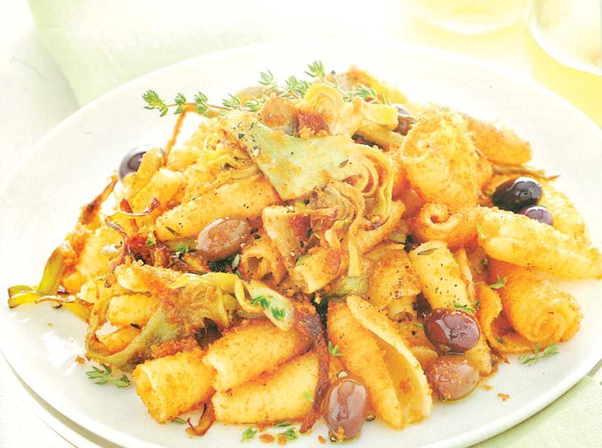 PRIPREMA: Artičoke očistiti, odstraniti vanjske listove, prepoloviti, izrezati na tanje komade i staviti desetak minuta u vodu zakiseljenu limunovim sokom. Na tri kašike ulja propržiti oguljen bijeli luk, ukloniti ga, usuti ocijeđene artičoke, majčinu dušicu i kratko propržiti na jakoj vatri. Posoliti, pobiberiti, pržiti još desetak minuta na laganoj vatri i dodati masline. Prezlu propržiti na 3 kašike ulja. Tjesteninu skuhati u slanoj vodi, pomiješati s prezlom i artičokama. Odmah poslužiti.