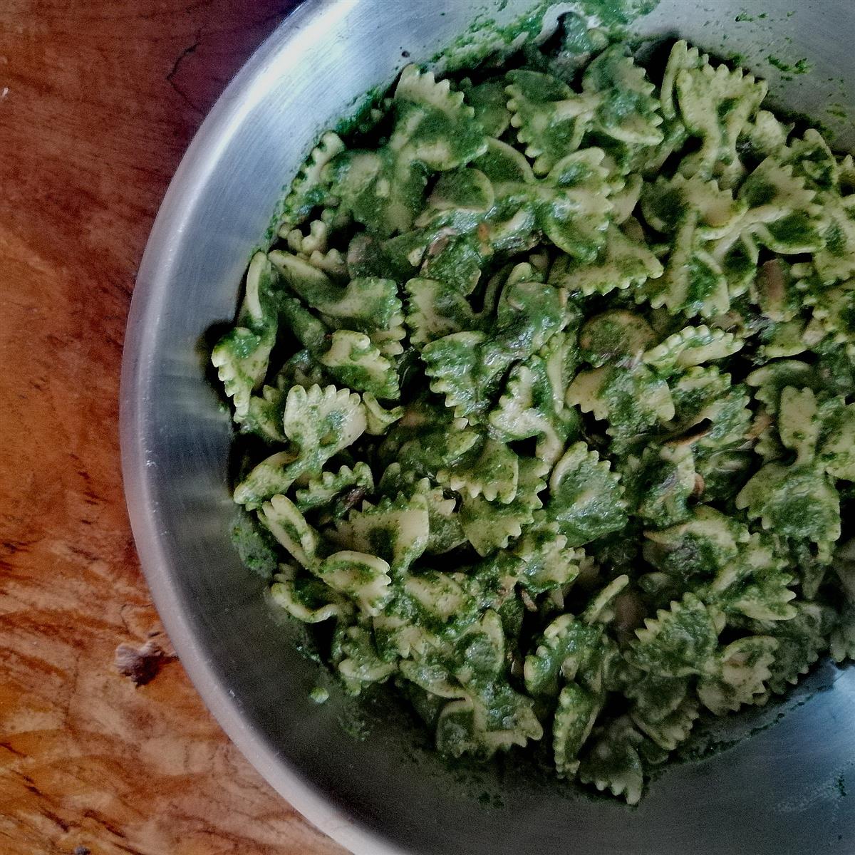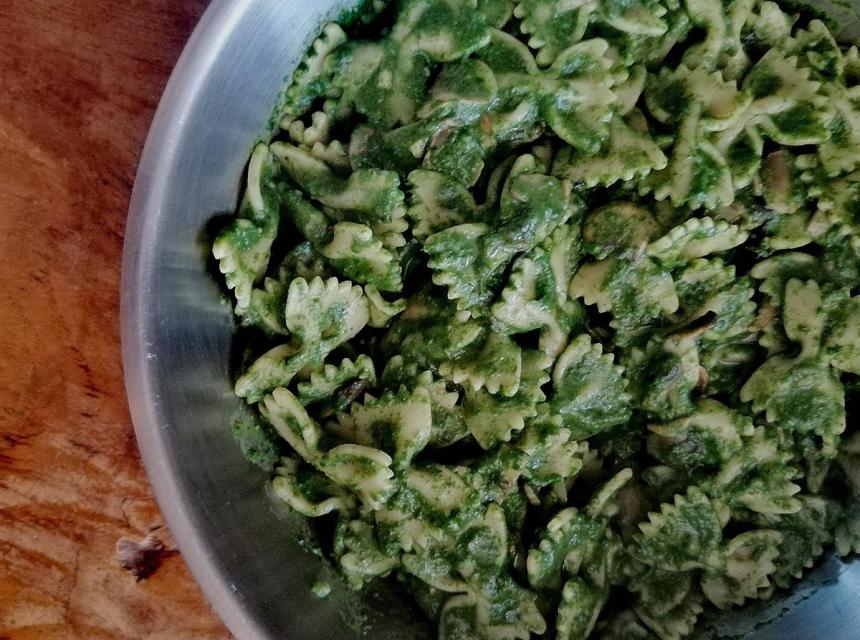 Na laganoj vatri dinstati češnjak. Dodati gljive. Kad gljive povenu dodati špinat. Poklopiti da se špinat do kraja odmrzne. Dodati vrhnje za kuhanje. Začiniti solju i s friško mljevenim paprom i korijandarom.