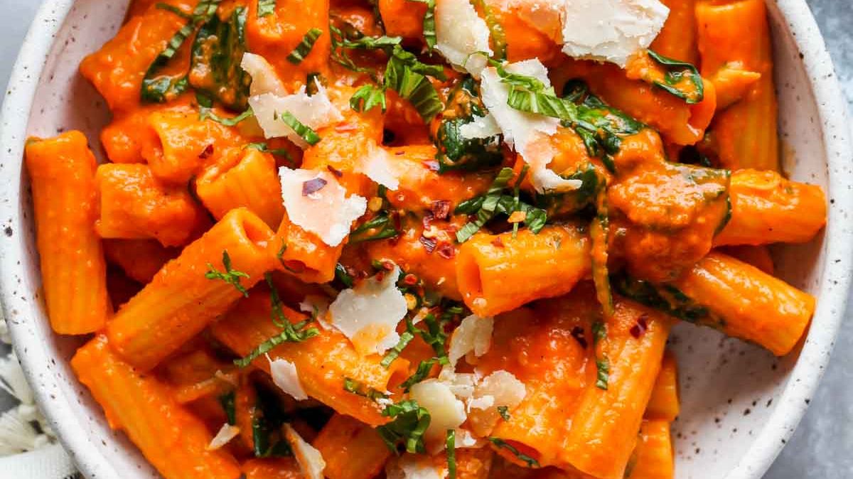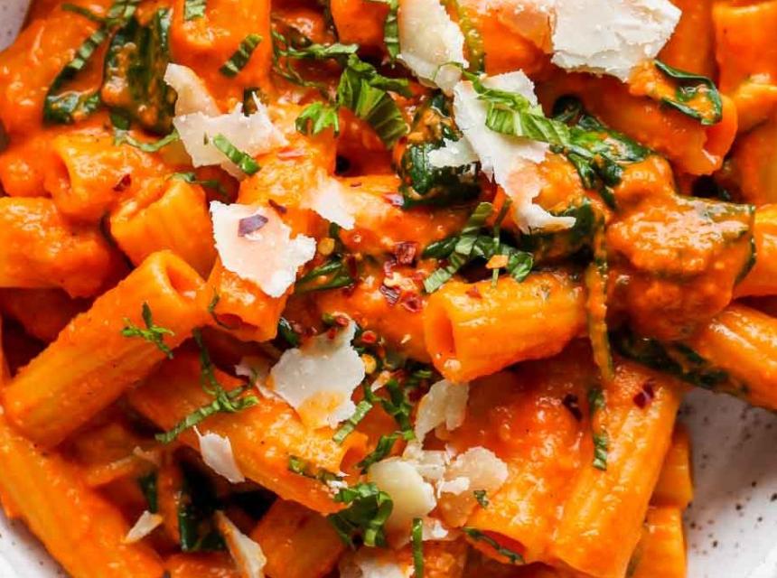 Sastojci: 4 crvene paprike, 2 kašike maslinovog ulja, 1 luk, 4 fileta inćuna, 1 ljuta paprika, 200 g pelata, pola limuna, 2 kašike povrtnog temeljca, 400 g tjestenine, so, svježe mljeveni biber.