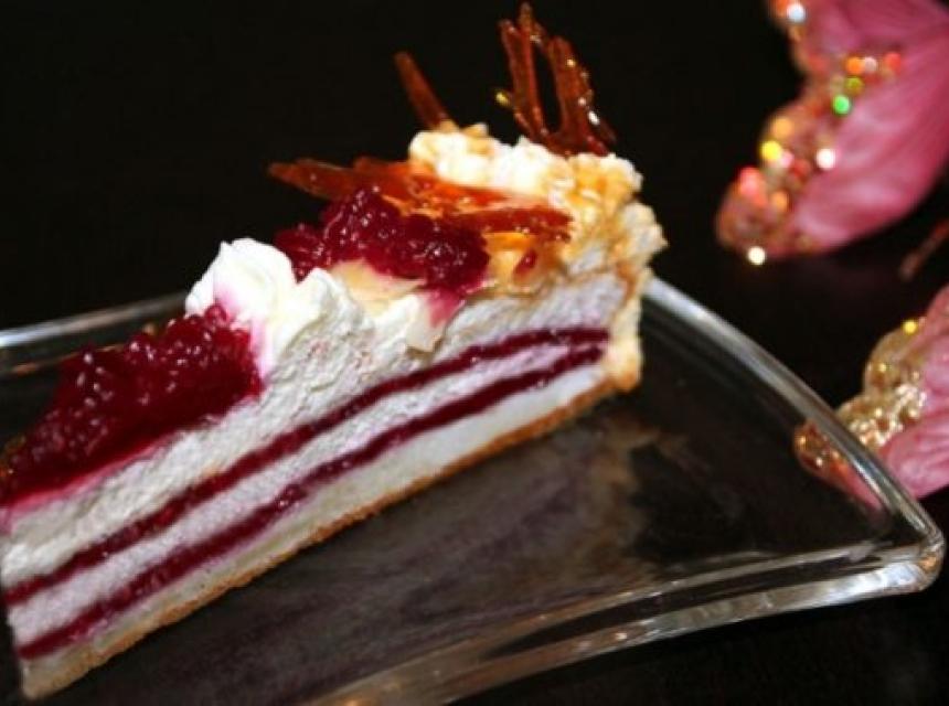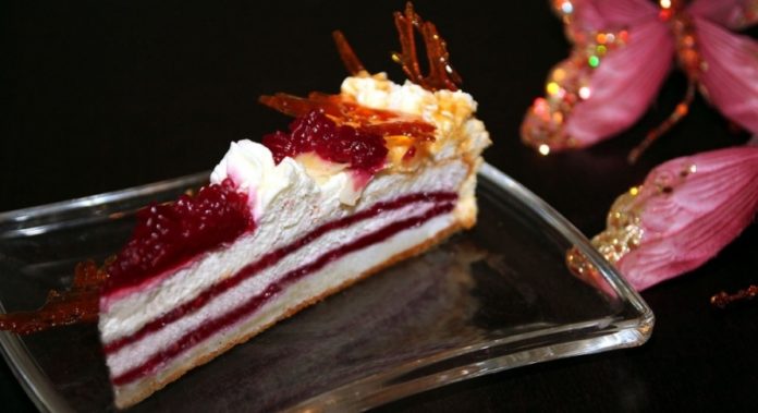 Složite ovako: biskvit – pola kreme od malina – mousse od bijele čokolade – biskvit – ostatak kreme od malina (ostavite malo za dekoraciju) – ostatak moussea od bijele čokolade – dekoracija po želji. Dobro rashladite i uživajte.