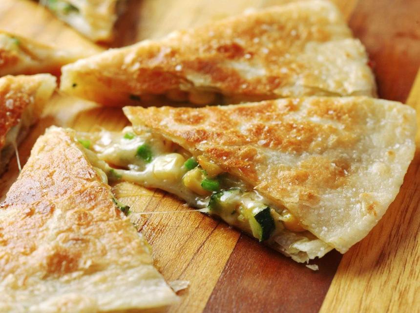Ponovite postupak s preostalim tortiljama i nadjevom. Kada budu pečene, izrežite ih na trokute i poslužite.
