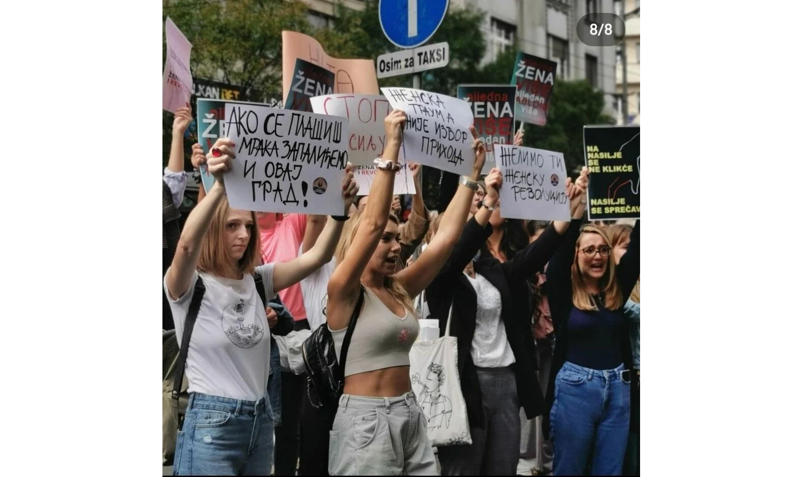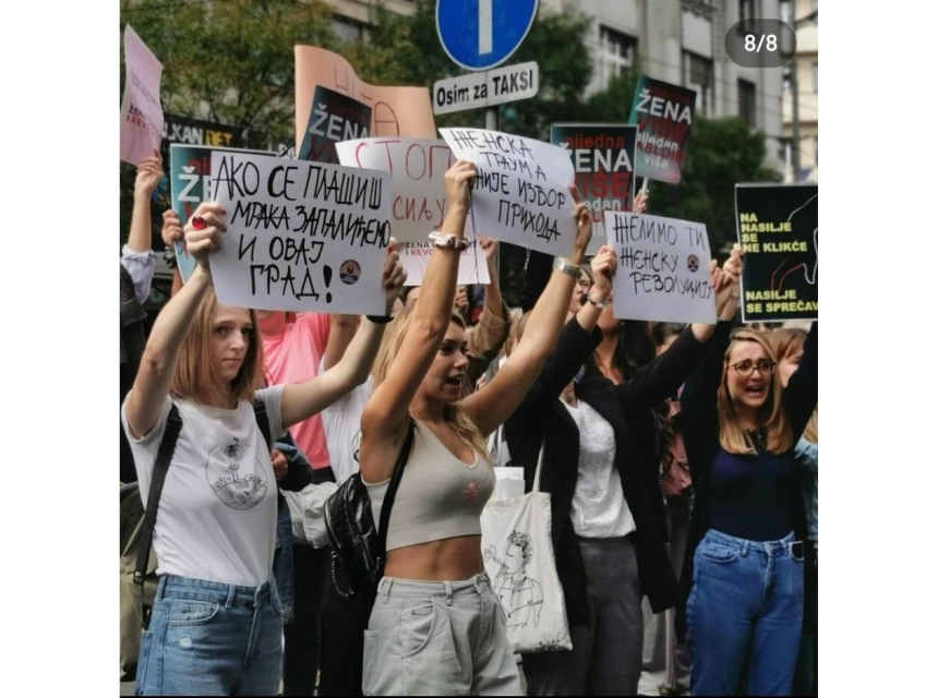 Kako prenosi srbijanski portal Danas, prisutni su nosili transparente s natpisima "Ljute smo", "Ako se plašiš mraka zapalit ćemo ovaj grad", "Ženska trauma nije izvor prihoda", "Mnogo smo bijesne", a čule su se i parole kojima se traži gašenje tabloida.