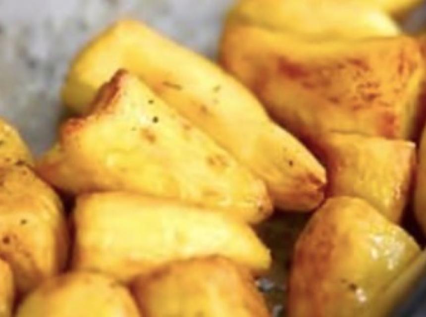 Morgan zagrije pećnicu na 220 pa oguli krompire i nareže ih na komade željene veličine. Prvo ih kuha u posoljenoj vodi dok ne omekšaju, a potom ocijedi pa stavlja u pladanj na krompir za pečenje te posoli i začini.