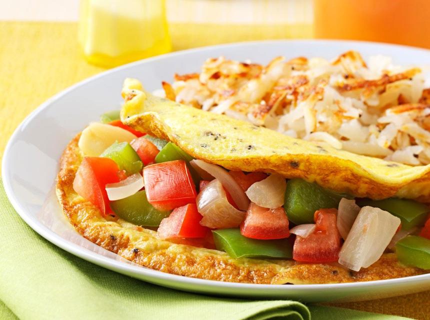 Na ispržena jaja posložite dva lista tost sira i povrće. Preklopite i poslužite na tanjur.