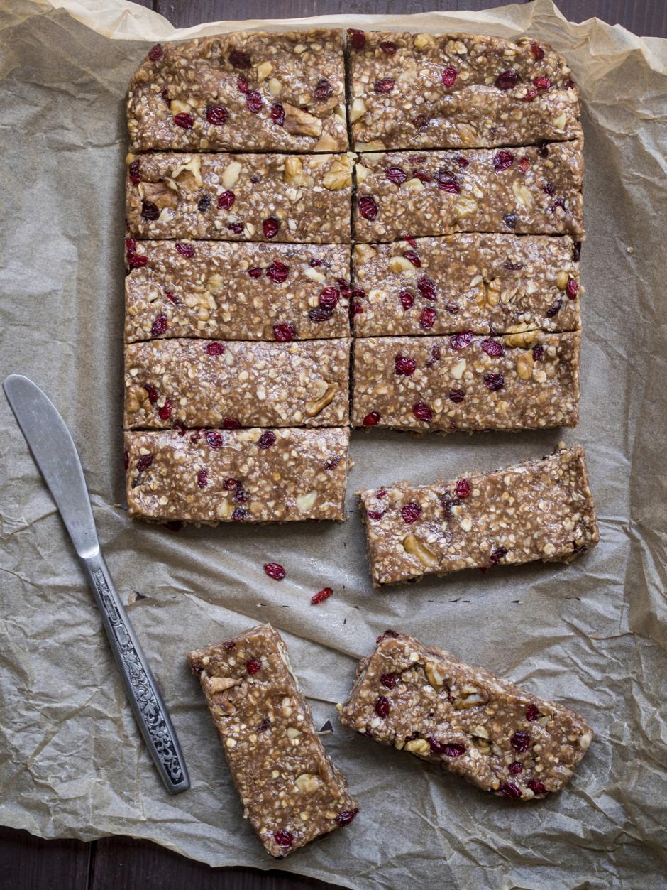Priprema: Zagrijte rernu na 180 Celzijevih stepeni. Stranice dubljeg lima za pečenje pokrijte folijom i nju nauljite. Bademe i sjemenke popržite na tavi. U posebnoj posudi zagrijte puter i med i miješajte dok se puter ne otopi. Dodajte ostale sastojke, osim čokolade, te sve dobro promiješajte. Čokoladu dodajte kad se smjesa malo ohladi. Smjesu lagano utisnite u lim za pečenje i pecite 30 minuta. Ohladite i narežite na komade.