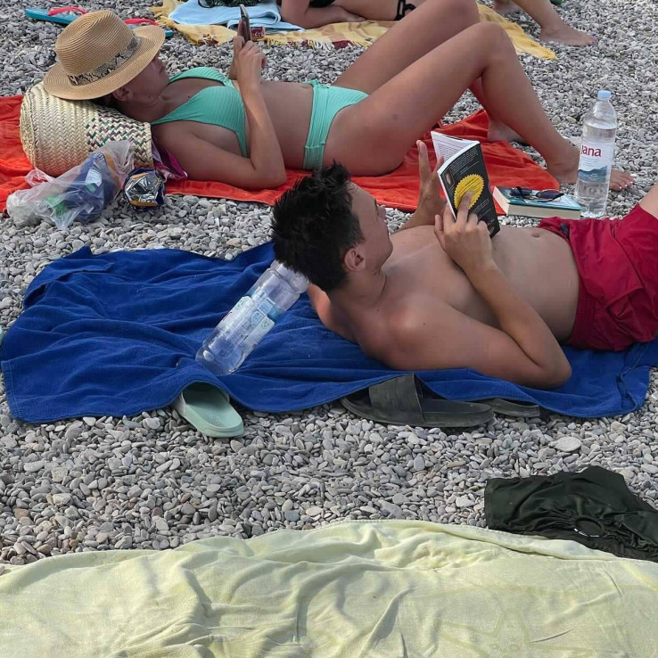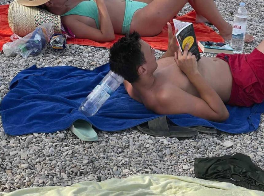 Na njoj se vidi par koji leži na plaži, a pažnju privlači domišljatost muškarca koji je na originalan način našao oslonac za glavu.