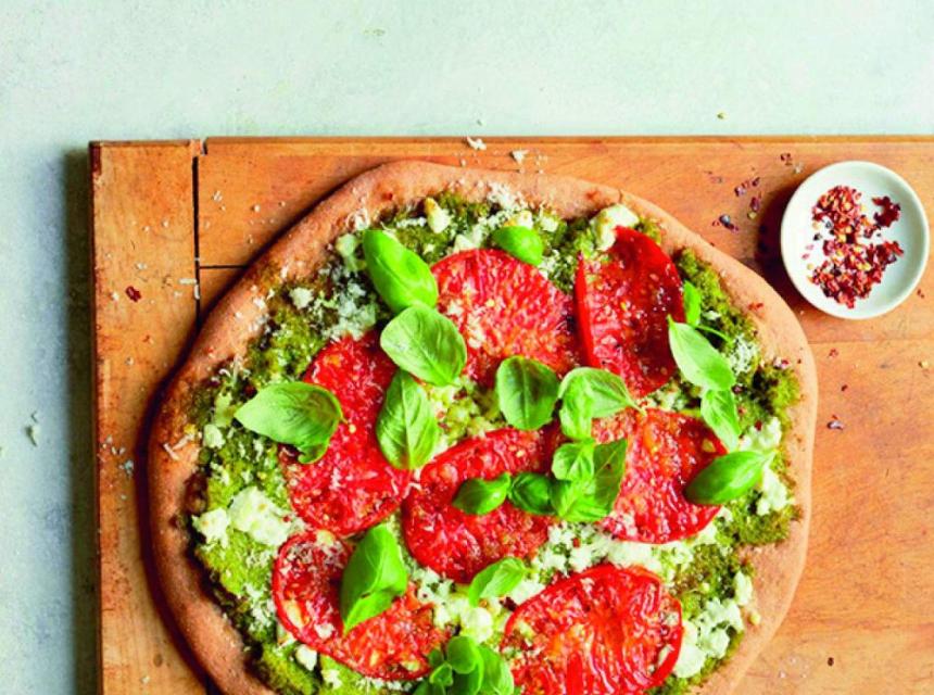 - Premažite je pestom te obložite kriškama paradajza i maslinama.
