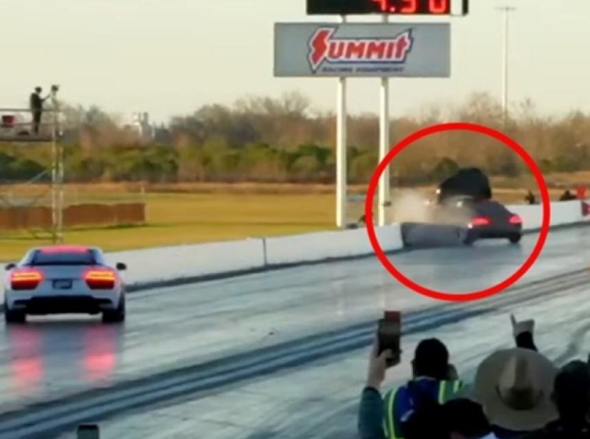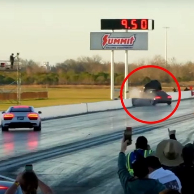 Velika snaga nerijetko donosi probleme u prijenosu na podlogu kada automobil može lako izgubiti trakciju. Upravo to se dogodilo crnom Audiju, čiji je vozač taman pred kraj četvrt milje izgubio kontrolu nad automobilom. Audi naglo skreće ulijevo i pri brzini debelo većoj od 200 km/h završava u zaštitnom zidu.