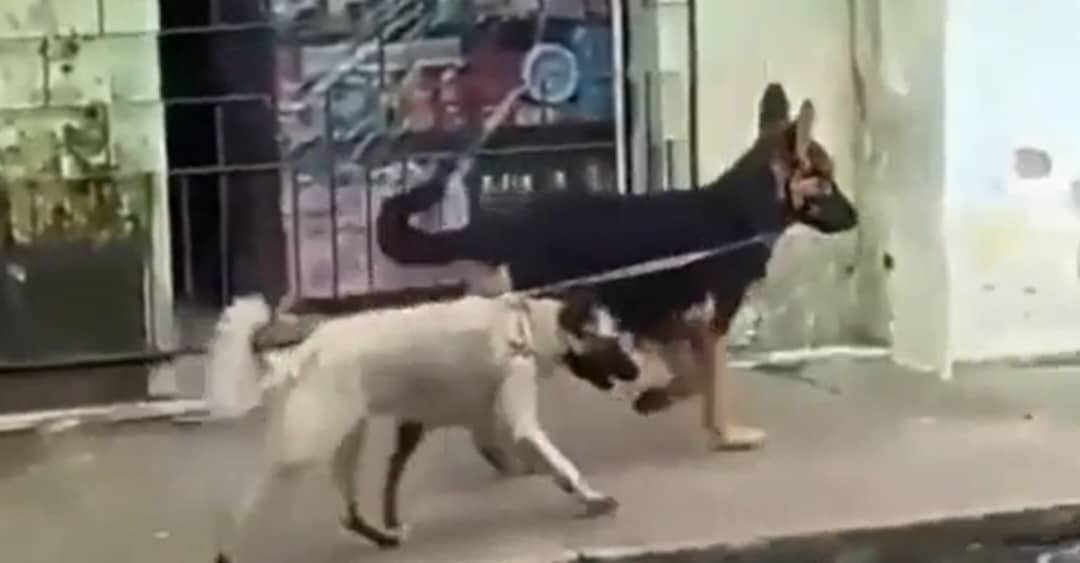 Snimka je nedavno objavljena na Redditu, a na njoj su dva psa koja su međusobno povezana uzicom. Veći pas, njemački ovčar, trči oko manjeg psa, usmjerava ga i vuče prema naprijed.
